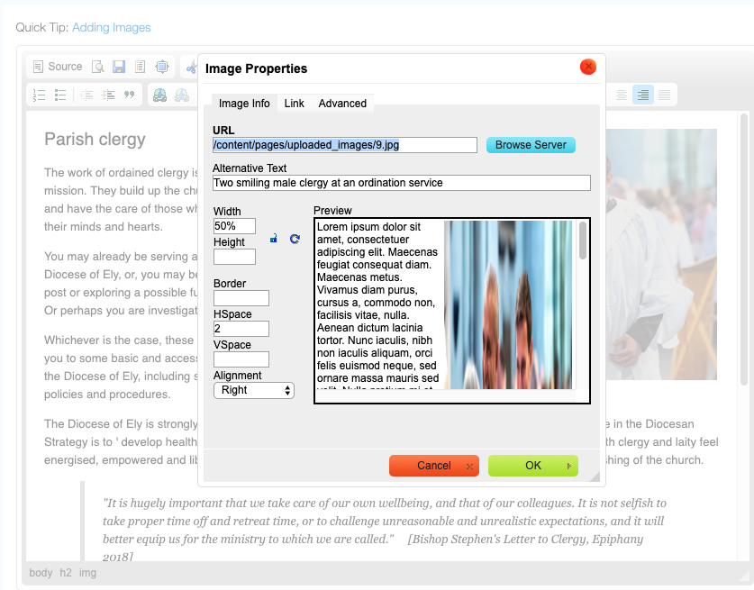 In broad terms, any fixed-width images, videos or tables within the site might not appear so well within smaller mobile browsers. The general principle is that any images, videos or tables within the content pages will appear better, across different devices, if their widths are defined as a percentages(%) — rather than a fixed width dimension (such as pixels). To define an image in percentages within the page editor, right click on the image > image properties. Add the width as a percentage and remove the height dimension. With video iframes you need to retain a height dimension.